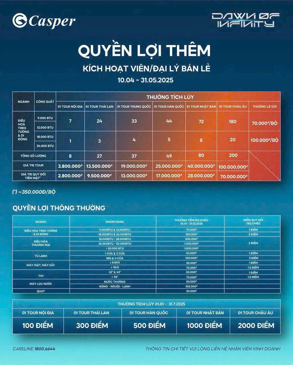✅ Không chỉ có máy lạnh, các dòng sản phẩm khác như: tivi, máy giặt, tủ lạnh, máy sấy Casper cũng có chương trình thưởng và tour riêng.