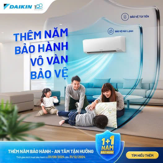 Nhằm kỷ niệm 100 năm thành lập, Daikin tặng thêm một năm bảo hành, nâng tổng thời gian bảo hành lên 2 năm. Điều này mang lại cho người dùng sự an tâm tuyệt đối khi trải nghiệm sản phẩm.