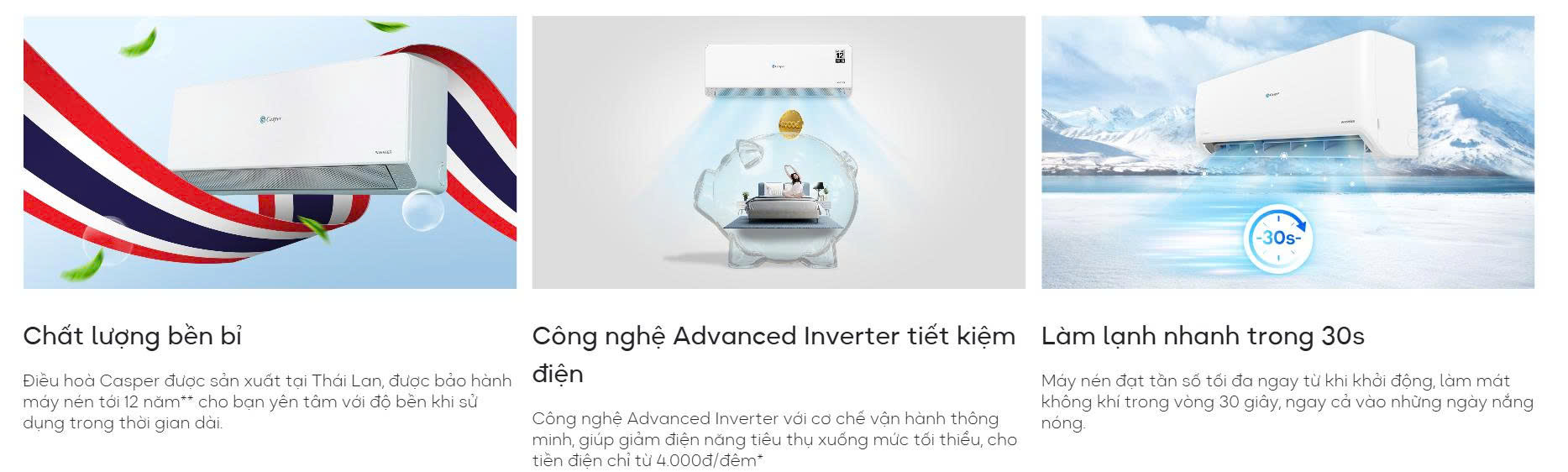 Điều hòa dân dụng Casper mang đến bầu không khí mát lành, dễ chịu cho cả gia đình với mức chi phí điện chỉ từ 4.000 đồng/đêm*. Kết hợp cùng bảo hành máy nén lên đến 12 năm (**), Casper là lựa chọn tối ưu cho người dùng đề cao hiệu quả tiết kiệm điện và độ bền lâu dài.
