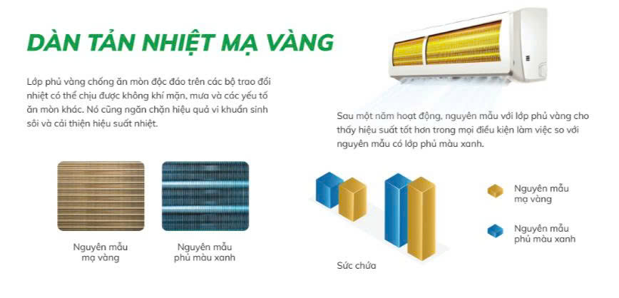 Dàn tản nhiệt phủ chống ăn mòn – tăng tuổi thọ máy, phù hợp khí hậu nóng ẩm Việt Nam.