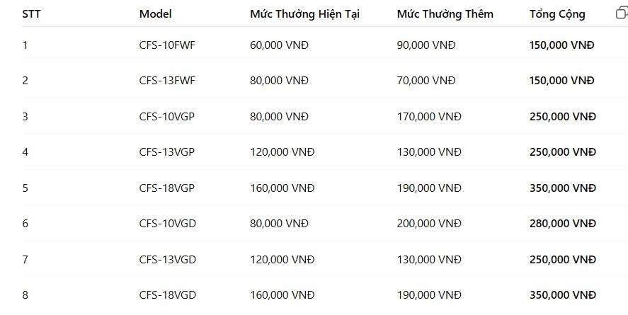 📌 Danh sách model điều hòa Comfee và mức thưởng tương ứng