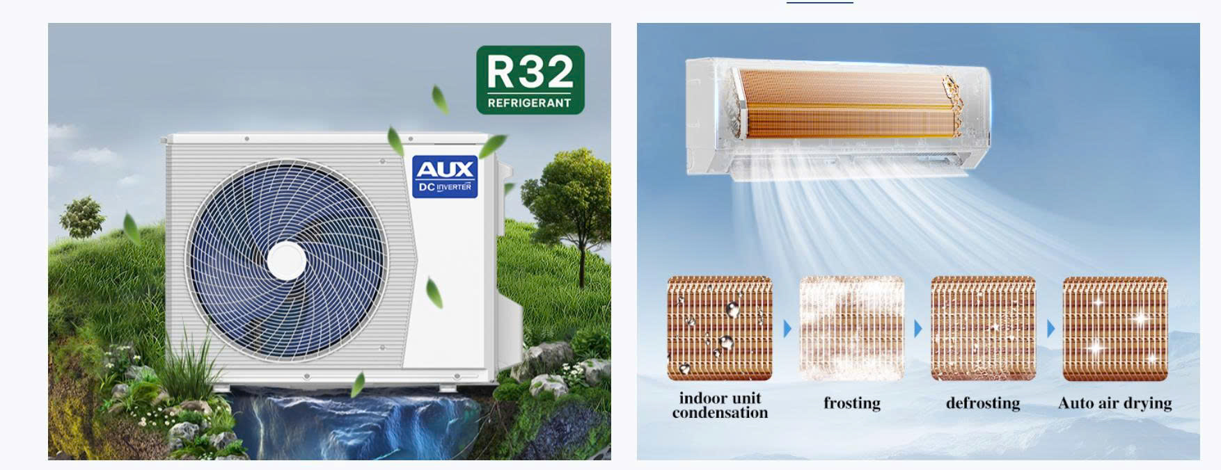 Máy lạnh AUX sử dụng môi chất làm lạnh R32 – loại gas thế hệ mới có hiệu suất làm lạnh cao, không gây hại cho tầng ozone và góp phần bảo vệ môi trường sống xanh.