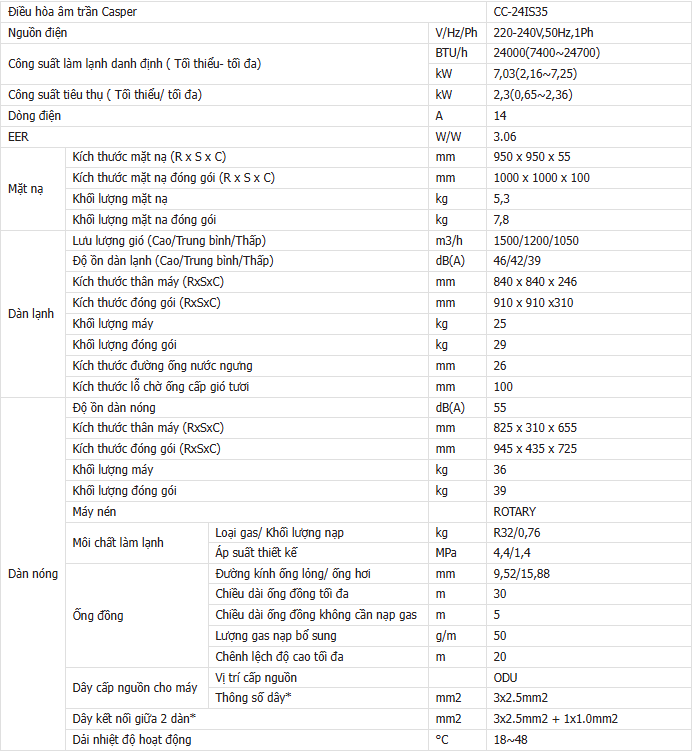 Thống số kỹ thuật Điều hòa âm trần Casper 24000BTU inverter 1 chiều CC-24IS35