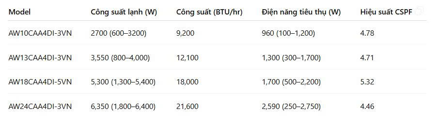AW13CAA4DI-3VN: Công suất 12.100 BTU – thích hợp cho phòng khách hoặc phòng ngủ lớn từ 15–20m².
