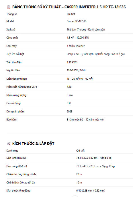 Máy Lạnh Casper Inverter 1.5 HP TC-12IS36 Model 2024 có khả năng làm lạnh nhanh ấn tượng nhưng vẫn đảm tiết kiệm điện năng hiệu quả. Máy còn có khả năng lọc đi bụi bẩn thông thường và mang đến cho người dùng không gian mát lạnh, trong lành. Ngoài ra, chiếc máy lạnh Casper này còn được tích hợp nhiều tiện ích để nâng cao trải nghiệm người dùng. Cùng điểm qua những điểm nổi bật trên chiếc máy lạnh này nhé!