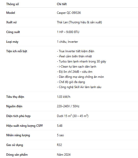 Máy Lạnh Casper Inverter 1 HP QC-09IS36, phù hợp lắp đặt cho những căn phòng có diện tích nhỏ từ dưới 15 m2, giúp máy hoạt động bền bỉ và ổn định trong suốt thời gian sử dụng cũng như mang lại hiệu quả làm mát tối ưu.
