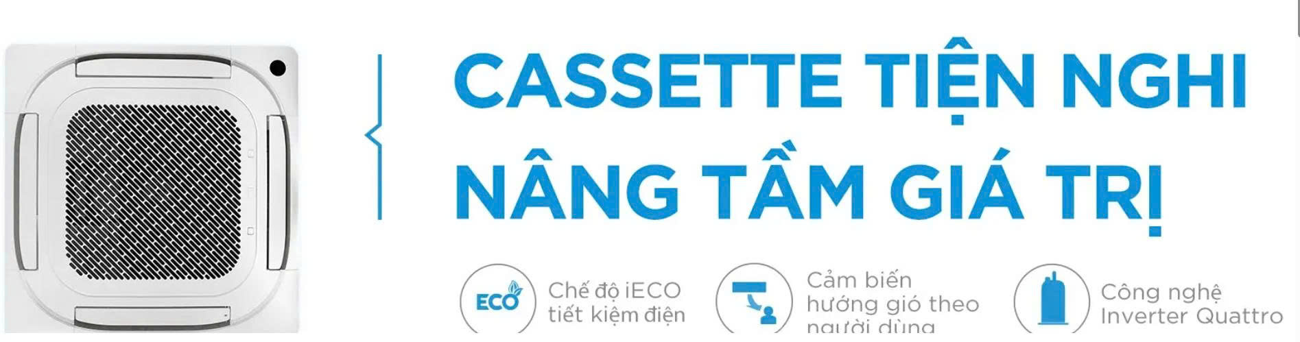 Ứng dụng công nghệ Inverter giúp máy cassette vận hành êm – bền – tiết kiệm điện, phù hợp cho doanh nghiệp, văn phòng, khách sạn cần duy trì nhiệt độ ổn định với chi phí hợp lý.