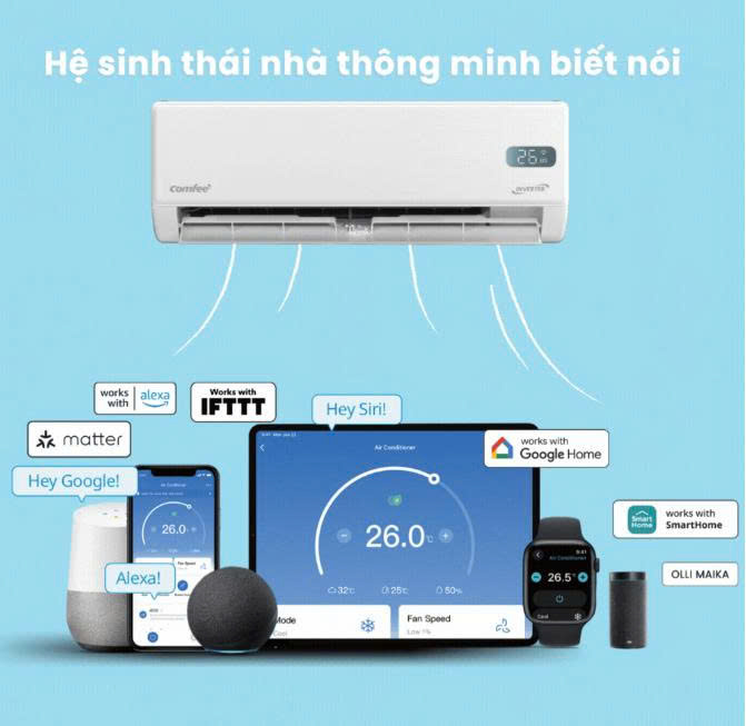 Với khả năng kết nối hệ sinh thái nhà thông minh, điều hòa Comfee hỗ trợ kết nối nhiều thiết bị, bao gồm máy tính bảng, loa thông minh và đồng hồ thông minh, cho phép bạn điều khiển điều hòa rảnh tay tại nhà bất cứ lúc nào.