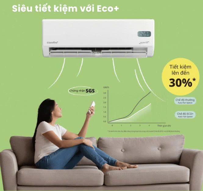 Chỉ với một lần nhấn nút ECO+, máy điều hòa sẽ tiết kiệm hơn 30% năng lượng so với chế độ làm mát thông thường mà vẫn đảm bảo được sự mát lạnh mong muốn được chứng nhận bởi SGS.