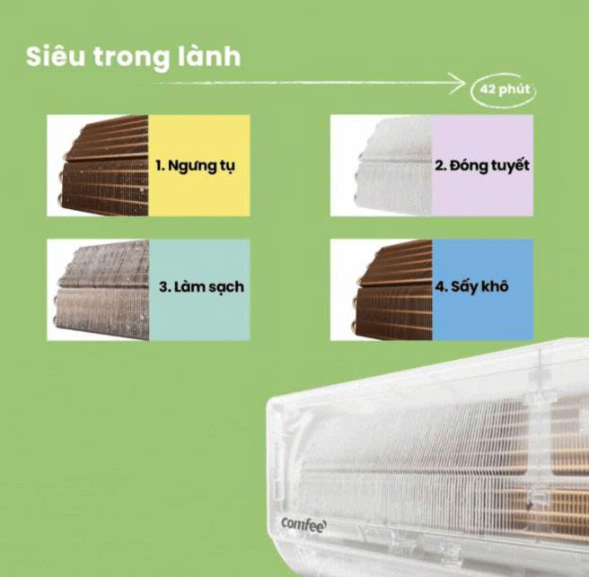 Điều hòa Comfee Inverter được nâng cấp từ chế độ rửa bằng nước (20 phút) lên chế độ làm sạch bằng băng (42 phút).