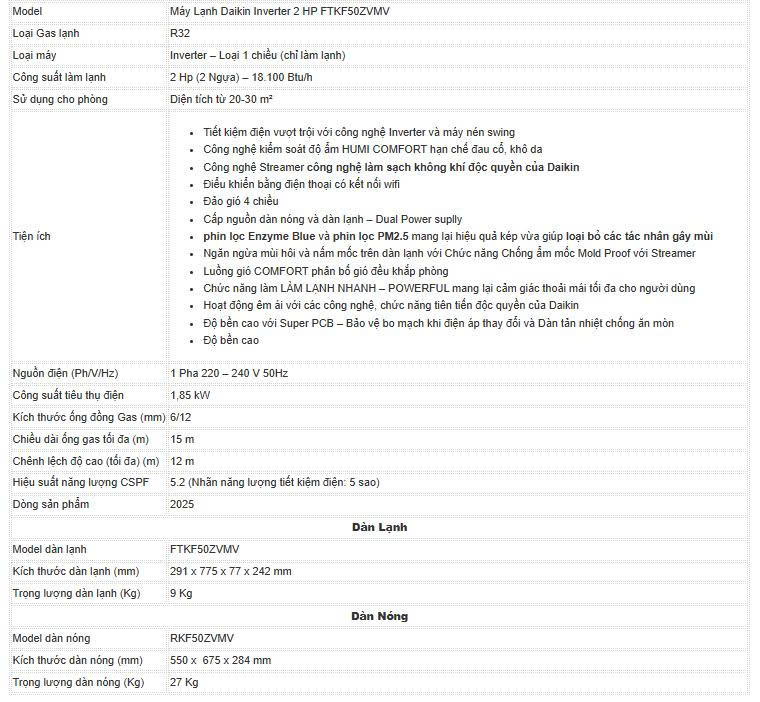 – Phạm vi hoạt động hiệu quả: chiếc điều hòa Daikin này hoạt động với công suất làm mát 2 HP ~ 18.100 BTU, là giải pháp làm mát lý tưởng cho phòng có diện tích từ 20-30m2.