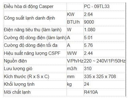Thống số kỹ thuật Điều hòa di động Casper 9000BTU PC-09TL33