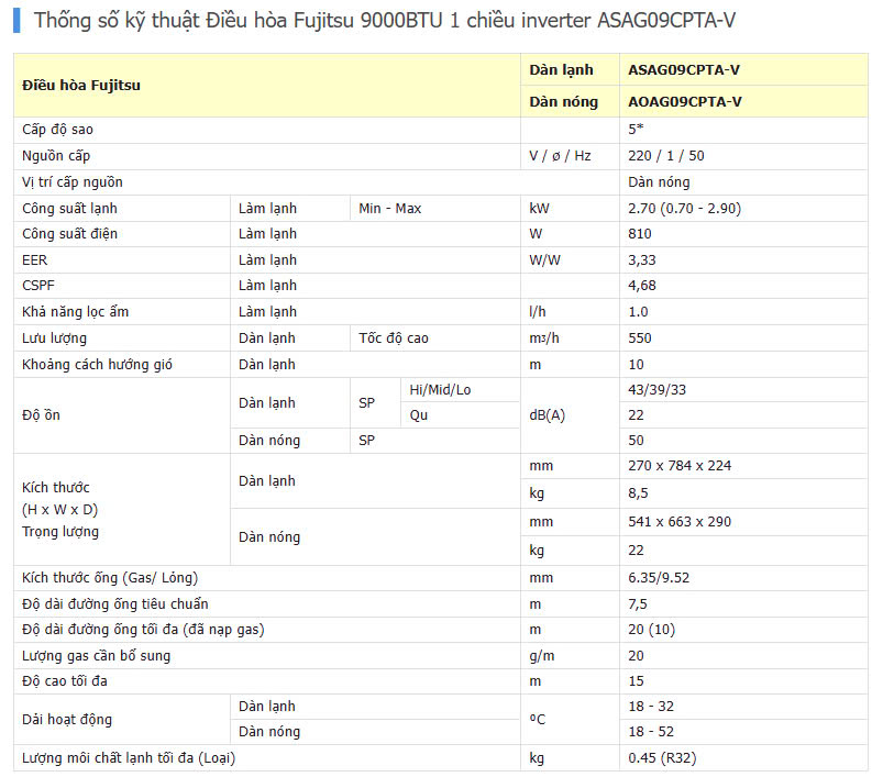 Với công suất điều hòa 9000BTU, Fujitsu ASAG09CPTA-V phù hợp lắp đặt cho phòng có diện tích dưới 15m2: Phòng ngủ, phòng làm việc …Lựa chọn công suất máy phù hợp với diện tích sẽ giúp máy hoạt động ở trạng thái tốt nhất và bền bỉ nhất, chính vì vậy khi mua sản phẩm khách hàng cũng cần đặc biệt lưu ý.