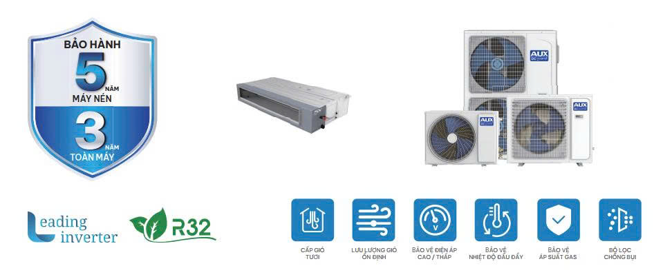 Dòng máy lạnh giấu trần nối ống gió của hãng AUX sử dụng môi chất R32, công nghệ biến tần 1 chiều DC, tiết kiệm điện và vận hành êm ái. Thiết kế giấu trần phù hợp với không gian yêu cầu thẩm mỹ cao như biệt thự, chung cư, văn phòng, khách sạn, nhà hàng. Sản phẩm có khả năng cấp gió tươi, hai hướng hồi gió linh hoạt, hai hướng thoát nước ngưng, hộp điều khiển rời tiện bảo trì, tự động khởi động lại khi có điện, tích hợp bơm nước ngưng tiêu chuẩn và hỗ trợ nhiều tùy chọn điều khiển như WI-FI, thẻ phòng. Các model công suất lớn của AUX được trang bị công nghệ làm mát PCB bằng môi chất giúp tăng độ bền và ổn định.
