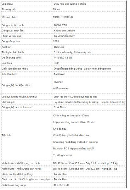 Với những tính năng và chế độ đa dạng trên, điều hòa Midea Celest Inverter MSCE-19CRFN8 không chỉ đáp ứng nhu cầu làm mát mà còn mang đến sự tiện nghi và bảo vệ sức khỏe cho gia đình bạn.