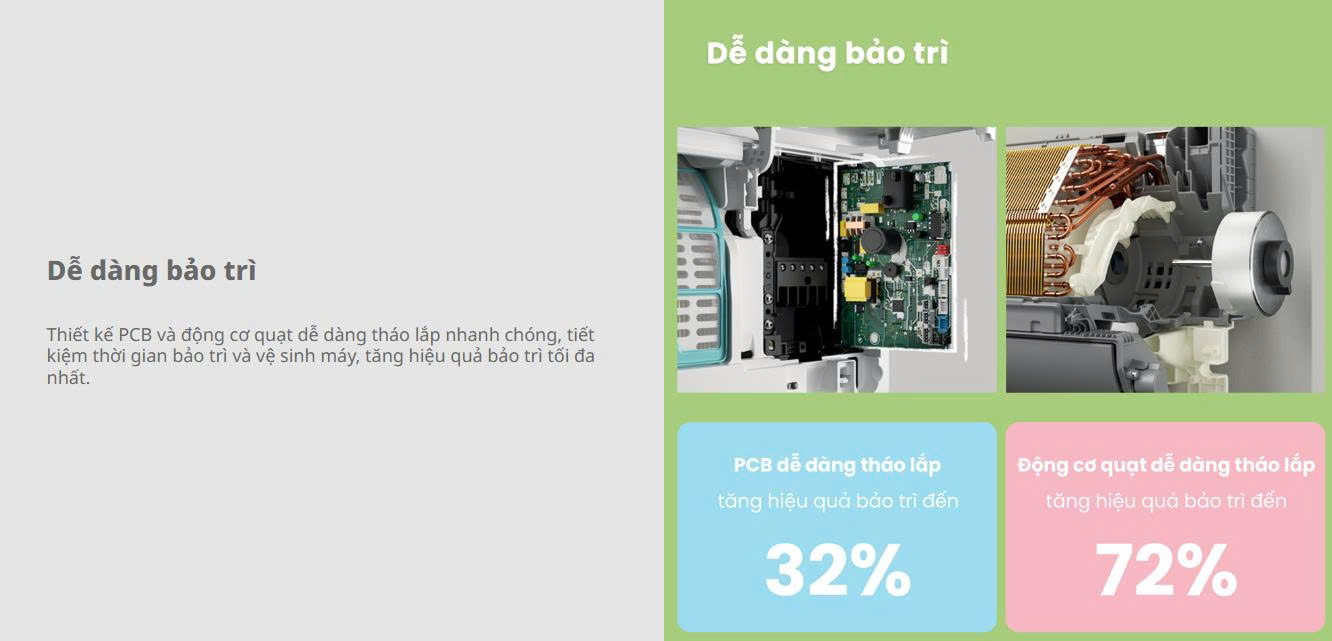 Thiết kế cho phép thao lắp PCB & mô-tơ quạt nhanh chóng, rút ngắn thời gian vệ sinh – bảo trì.