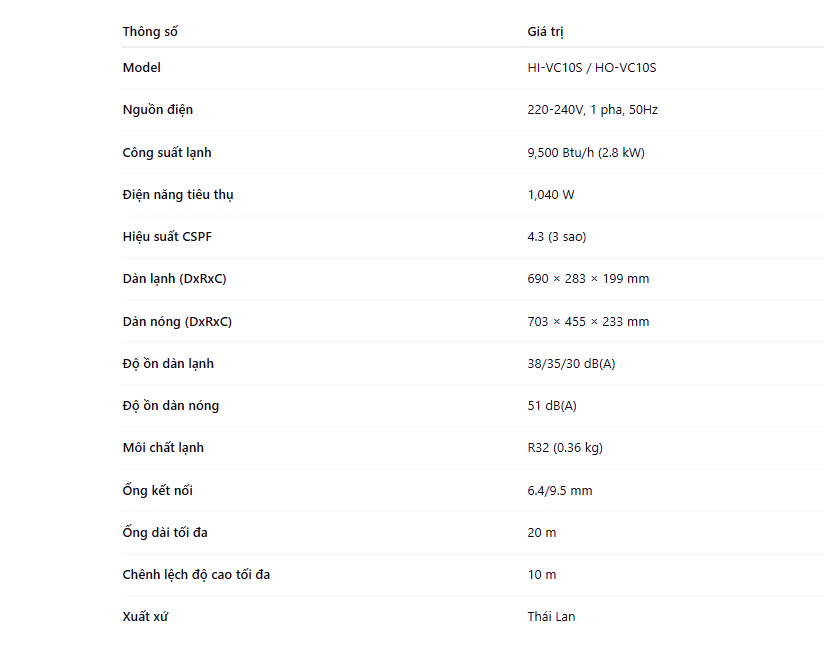 • Dải công suất : 1.0 HP ( 9500 BTU)