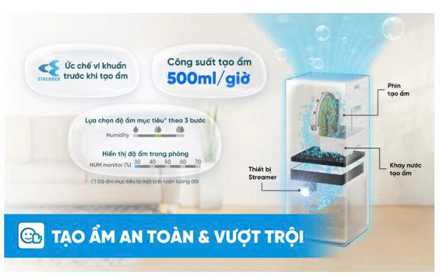 Chế độ tạo ẩm tự động: Điều chỉnh quạt và độ ẩm phù hợp với môi trường.